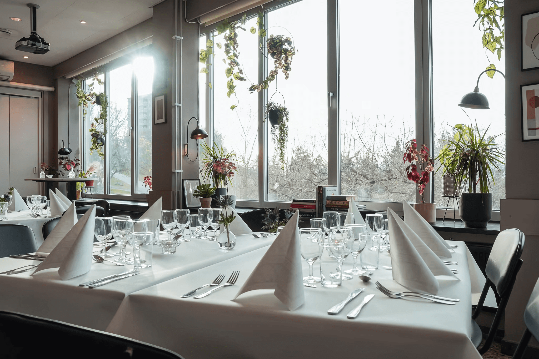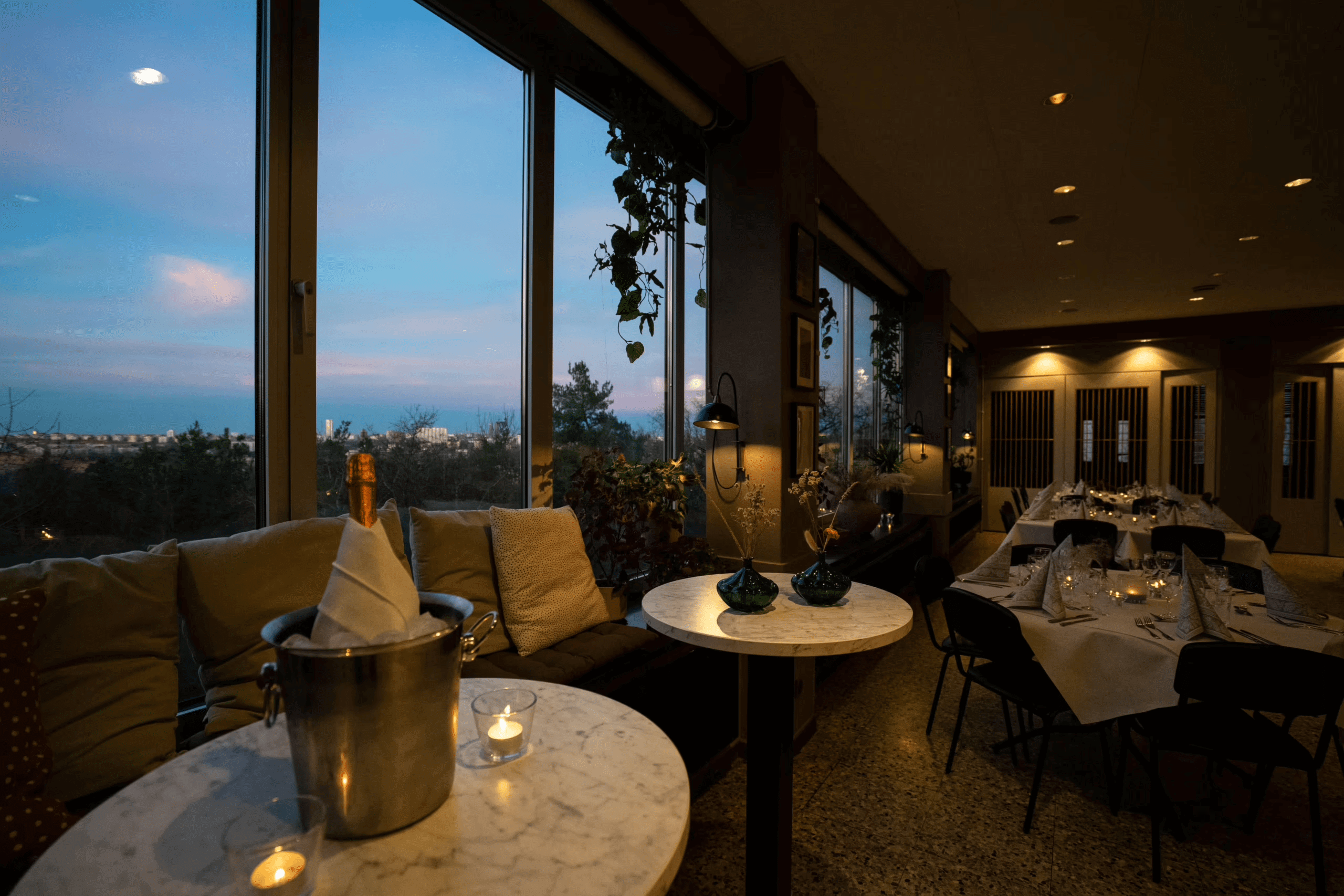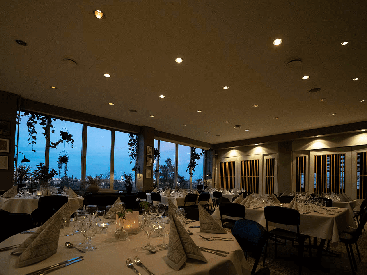 Ljus och modern festlokal med stora panoramafönster och storslagen utsikt över Stockholm. Perfekt för bröllop, företagsfester och disputationer.